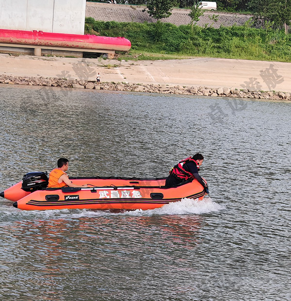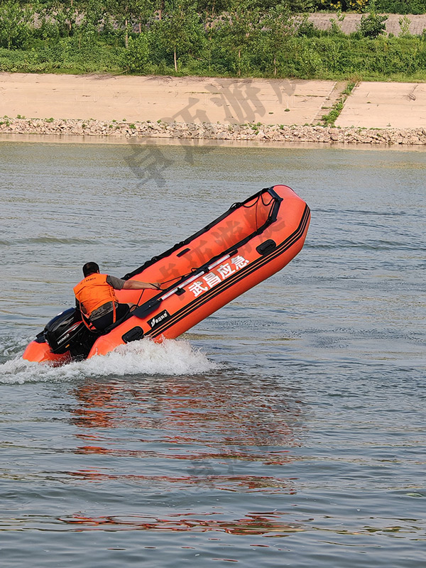 某应急管理部门为提升水域救援能力,采购了 4.7 米橘红色橡皮艇。该艇采用高强度耐磨材质,稳定性好、吃水浅,可快速投入防汛抢险、人员搜救等场景,是应急救援队伍的重要装备之一。图中为救援人员在水域开展实操演练,验证橡皮艇的动力性能与操控性,为后续应急处置工作筑牢装备基础。