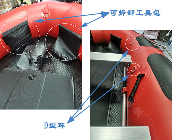 10.艇身配置:底部稳定小浮筒一对,艇身安装3M防水反光条8处,翻船自救辅助绳包,艇艏安装防水溅收纳包一个,艇艉板安装引擎工具包一个,艇艏安装挡水片,艉板安装快速双排水孔,艇身安装多功能双向不锈钢牵引环,艇身安装缆绳不锈钢固定环,艇身安装油箱.油管稳定扣,软质抬船把手≥8个。